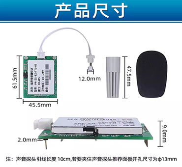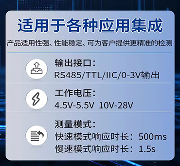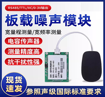 PCB板載安裝方式,30~130dBA寬量程、20~12.5KHz寬頻率測(cè)量,輸出接口TTL或RS-485出廠(chǎng)可選,供電電源4.5V~5.5VDC、10~28VDC可選。