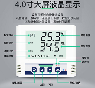 ·產(chǎn)品采用大屏液晶顯示,具有溫濕度上下限雙重控制,自由設(shè)置限制,可以實(shí)現(xiàn)高低溫度報(bào)警與高低濕度報(bào)警并實(shí)時(shí)顯示。